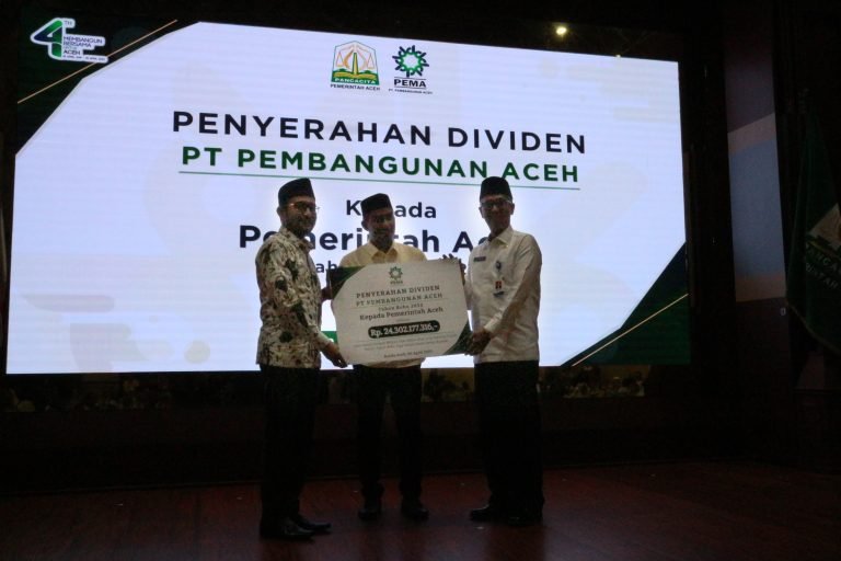 BANDA ACEH – BUMA Aceh yakni PT Pembangunan Aceh (PEMA), melaporkan kenaikan pendapatan pada tahun 2022 senilai Rp. 24,3 Miliar atau meningkat sekitar 13% dari pendapatan tahun 2021. Penyerahan dividen tersebut dilakukan pada Rabu, (05/04/2023) di Anjong Mon Mata , Banda Aceh, bertepatan dengan Ulang Tahun PT PEMA ke 4. Penyerahan dividen senilai Rp. 24,3 Miliar itu dilakukan langsung oleh Direktur Utama PT Pembangunan Aceh Ali Mulyagusdin kepada Pemerintah Aceh, dalam hal ini Pj Gubernur Achmad Marzuki yang diwakili oleh Asisten Administrasi Umum Sekda Aceh, Iskandar AP.